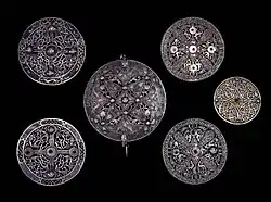 Four of the disc brooches belong to two non-identical pairs.[note 2] All four items are made in silver sheet metal with an openwork design. They are embellished with intricate plant, animal and geometric ornamentation in panels surrounding a central cross-shaped area. All of the brooches were originally topped with multiple bossed rivets; many of the bosses are missing.[6]