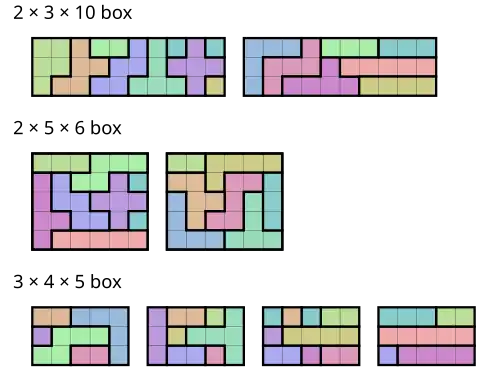 A pentacube puzzle or 3D pentomino puzzle, amounts to filling a 3-dimensional box with the 12 flat pentacubes, i.e. cover it without overlap and without gaps. Since each pentacube has a volume of 5 unit cubes, the box must have a volume of 60 units. Possible sizes are 2×3×10 (12 solutions), 2×5×6 (264 solutions) and 3×4×5 (3940 solutions).[12]