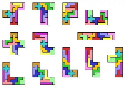 The eight possible orientations of the F, L, N, P, and Y pentominoes, and the four possible orientations of the T, U, V, W, and Z pentominoes are illustrated: