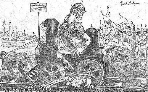The hawkish agitation won over deputies of the NP, including Georgi Peev; in August, the pro-war caucus reportedly threatened to replace Geshov with Radoslavov.[146] Geshov was unanimously supported by the cabinet in declaring war on the Porte during the final days of that month.[147] He held on to the premiership throughout the resulting First Balkan War: during the conflict, the "Balkan League" (an informal alliance, largely reflecting Geshov's own optimistic approach to international treaties)[148] won major gave chase to the Ottoman Army. Following victory at Lule Burgas, the PLP ministers, including Aleksandar Lyudskanov, Anton Frangia, and Peter Abrashev, pressed its Populist partners to push for an occupation of Istanbul, but they were "against continuing the operation". Ferdinand and General Mihail Savov ignored such objections, and ordered a move toward the Ottoman capital—resulting defeat at Çatalca.[149] To the despair of Bulgarian peasants, the conflict also opened up new venues for corruption, with the NP's clientele, now centered on a network of quartermasters, directly engaged in confiscating and selling food for personal gain.[150]
