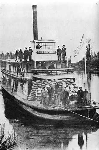 In 1863, a new independent steamer, the Enterprise, was built at Canemah by Capt. George A. Pease, backed by a company formed by Capt. Charles. W. Pope (1831-1871), Capt. Nat H. Lane, Sr. (1823-1878), C. Friendly, Judge Riley E. Stratton, C. Crawford, James Wilson, C.W. Rea, and S. Ellsworth.[8] Enterprise, the second steamer of this name to operate on the Willamette, was launched in November 1863, and ran independently for a short time under George Pease. Soon an accommodation was reached with the P.T. Company, after which Pease remained in command for over two years.[8] In 1866, the P.T. purchased Enterprise outright from its original owners.[8]
