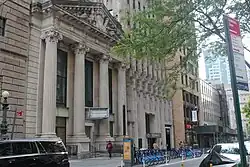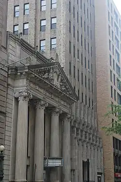 The original building's facade, by Mowbray & Uffinger, is made of white marble quarried from Dover, New York, as well as polished pink granite quarried from Milford, Massachusetts.[13][14] Granite is used on the water table, while marble is used on the rest of the facade.[14] The primary element of the Montague Street facade is a tetrastyle portico with four fluted columns supporting a triangular pediment.[12][14] Each column measures 27 ft (8.2 m) tall and measures 3.83 by 3.83 feet (1.17 by 1.17 m) across.[15] The columns have variously been cited as weighing 20 short tons (18 long tons; 18 t),[16] 24 short tons (21 long tons; 22 t),[15] 28 short tons (25 long tons; 25 t),[13][17] or 40 short tons (36 long tons; 36 t).[18] At the time of the bank building's construction, they were among the largest columns used in a building in the New York City area.[18] Each of the columns is placed on a large pedestal[12] and is topped by Scamozzi-style capitals of the Corinthian order.[14]