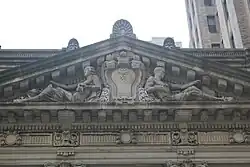 The columns on Montague Street support an architrave, which contains gutta, regula, and taenia decorations above each of the columns' capitals. Above the architrave is a frieze with acanthus motifs corresponding to the tops of each column.[14] The frieze originally had the inscription "The People's Trust Company" in capital letters, flanked by acanthus motifs.[18][19] When this inscription was covered in the 1970s, panels with cartouche-and-bellflower motifs were placed in each bay, while acanthus motifs were placed between the bays.[19] Just below the pediment is a cornice with modillions, as well as rosettes on the cornice's soffit. The pediment itself contains a cartouche with reclining sculpted figures on either side;[14] one depicts a man with a mallet, while the other depicts a woman with a purse.[19] The corners and the top of the pediment have acroteria.[12][14] There is a flat roof recessed from the pediment. The wall just below the roof is divided by rusticated pilasters that have palmettes and lions' heads at their capitals; the bays between each set of pilasters contain rusticated panels. Along the roofline is an architrave with fascia and a cornice with fluting.[14]