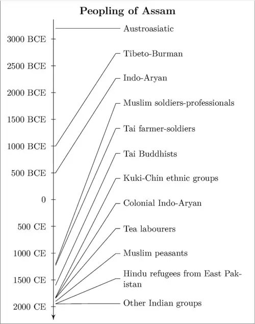 - ^ a b "An analysis of peopling of Assam on the above ethnolinguistic basis, coupled with the scanty paleolithic, neolithic and historical evidences, reveals that there are as many as eleven waves and streams of migration into Assam. (The terms ‘wave’ and ‘stream’ are used here with specific meanings: while ‘wave’ is used to mean a migration at a particular point of time, ‘stream’ means continuity of migration for a long period, which may continue even now ever since it started, albeit with varying volume)." (Taher 1993:202)