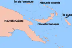 "At the same time, the few dozen kilometers separating the Bismarck Archipelago from Sahul were crossed: New Britain and New Ireland were reached, and then, one hundred and sixty kilometers away, the Buka Island in the north of the Solomon Archipelago: a true 28,000-year-old feat. Finally, to close the first phase in the settlement of Oceania, Manus Island (Admiralty Islands), 240 km north of the Bismarcks, was inhabited by Oceanians 12,000 years ago".[13]