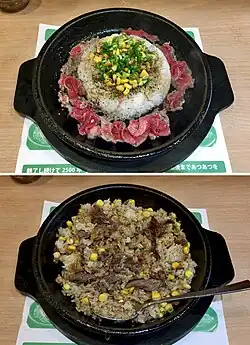 Pepper Lunch was created in 1994 by chef and inventor Kunio Ichinose, who wanted to serve quality fast food without hiring a chef. He devised a method using hot metal plates that are heated to 500 °F (260 °C) by an electromagnetic cooker. The raw meat with vegetables and/or rice are then placed on the plates, where they cook in front of the customer. The meat can be eaten rare or well done, depending on the customer's preference. The meal is then mixed with a choice of either the special honey brown sauce (Amakuchi) or garlic soy sauce (Karakuchi).[4]