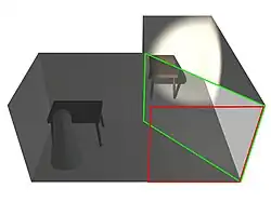 The core illusion involves a stage specially arranged into two rooms or areas, one into which audience members can see, and a second (sometimes referred to as the "blue room") that is hidden to the side. A sheet of plate glass, acrylic glass or plastic film is placed somewhere in the main room at an angle that reflects the view of the blue room towards the audience. Generally, this is arranged with the blue room to one side of the stage and the plate on the stage rotated around its vertical axis at 45 degrees.[5] Care must be taken to make the glass as invisible as possible, normally hiding the lower edge in patterning on the floor and ensuring lights do not reflect off it. The plate catches a reflection from a brightly lit actor in an area hidden from the audience. Not noticing the glass screen, the audience mistakenly perceive this reflection as a ghostly figure located among the actors on the main stage. The lighting of the actor in the hidden area can be gradually brightened or dimmed to make the ghost image fade in and out of visibility.