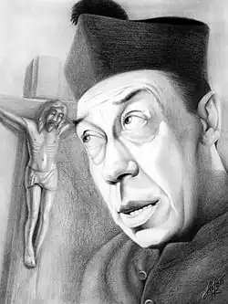 Don Camillo is a parish priest and is said to have been inspired by an actual Roman Catholic priest, World War II partisan and detainee at the concentration camps of Dachau and Mauthausen, named Don Camillo Valota (1912–1998).[1][2] Guareschi was also inspired by Don Alessandro Parenti, a priest of Trepalle, near the Swiss border. Peppone is the communist town mayor. The tensions between the two characters and their respective factions form the basis of the works' satirical plots.