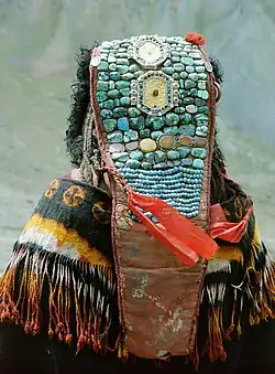 The perak is a symbol among the Ladakh of the rank and economic status of the woman wearing it.[1] Traditionally, the number of front-to-back rows of turquoise signified the status of the wearer: nine rows for the queen of Leh (the Ladakh capital), seven rows for the more modern aristocracy, five for the marvels, and three for the lower ranks.