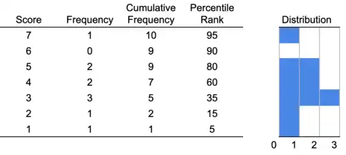 The figure illustrates the percentile rank computation and shows how the 0.5 × F term in the formula ensures that the percentile rank reflects a percentage of scores less than the specified score. For example, for the 10 scores shown in the figure, 60% of them are below a score of 4 (five less than 4 and half of the two equal to 4) and 95% are below 7 (nine less than 7 and half of the one equal to 7). Occasionally the percentile rank of a score is mistakenly defined as the percentage of scores lower than or equal to it, but that would require a different computation, one with the 0.5 × F term deleted. Typically percentile ranks are only computed for scores in the distribution but, as the figure illustrates, percentile ranks can also be computed for scores whose frequency is zero. For example, 90% of the scores are less than 6 (nine less than 6, none equal 6).