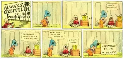 One such series, Always Belittlin', presaged Skippy with its star, a child with a striped shawl and a bonnet with a black pop-pom, whose thoughts consisted of the text's daily aphorism.[15] This series and two others, Bugville and Bug Lugs, would eventually run as the supplemental topper feature accompanying the Skippy Sunday strip.[16]