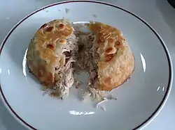 Perdeli pilav ("curtain pilaf") is a Turkish food, typically consisting of rice with chicken, onion and peanuts wrapped in a thin layer of dough, topped with almonds.