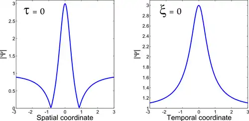 with the spatial coordinate and the temporal coordinate. being the envelope of a surface wave in deep water. The dispersion is anomalous and the nonlinearity is self-focusing (note that similar results could be obtained for a normally dispersive medium combined with a defocusing nonlinearity).