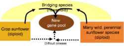 Many sunflower species can be artificially hybridized but one group of wild perennial species cross; the hexaploids (six copies of all chromosomes instead of the usual two copies) are especially easy to cross. Scientists are using this group to make “bridging crosses” that will bring together the genes from the crop sunflower and several other perennial species.