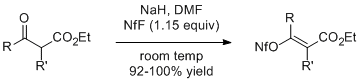The sodium enolates of β-ketoesters react with 1.15 equivalents of NfF to give the corresponding alkenyl nonaflates in high yield. Ethyl 2-methylacetoacetate (R=R'=Me) gives the geometrically pure E isomer by this method.[5]