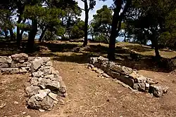 In ancient Greek and Roman architecture, a peribolos was a court enclosed by a wall,[1] especially one surrounding a sacred area such as a temple, shrine, or altar. This area, however, is not a necessary element to these structures since those built earlier only included markers (e.g. horoi or boundary stones) to indicate imaginary boundaries.[2] Excavations reveal that there are sanctuaries that included a peribolos later in its history, signifying a change in religious mentality.[2] During the Roman times, there were pereboloi used as meeting places to conduct business (e.g. shipping).[3]