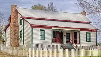 The Perkins House is significant as an example of a mid-nineteenth century vernacular farmhouse associated with a middle-class family in the rural area of eastern Mississippi during this period. Though very similar in style to an I-house, a popular style in the region during this era, the floor plan deviates from the I-house standard in several features, most obviously the absence of an inhabitable second floor.[2] The first floor layout consists of two 15 feet (4.6 m) by 17 feet (5.2 m) rooms divided by a central passageway. Shed style porches run the entire length of the front and rear facades and contain cabinet rooms in each corner. The centers of each of the porches are loggias; the rear one was originally open, but was closed in some time after 1994.[2][3] The southwest cabinet room has an entrance from the front loggia but no entrance into the interior of the house while the northwest cabinet room opens into the northern main room but has no entrance from the loggia.[2] The southeast cabinet room is a kitchen, and the northeast cabinet room is a bathroom which was originally open only to the northern main room but a second door was added into the rear loggia some time after 1994,[3] possibly when the rear loggia was enclosed.[2] Atop the first floor lies a small attic which was originally inaccessible,[3] but a ship's ladder was installed after 2012 to provide access.[2]