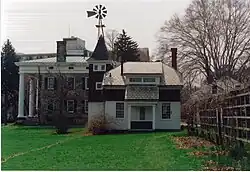 This view of the Perkins Stone Mansion shows the Wash House, one of the outbuildings on the property.