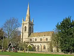 Although the village has a much longer history, the oldest buildings which now remain date back only as far as the late of the 18th century. The church of Saint John was built in 1876 and became the parish church in 1877.[2] The half-timbered Almshouses near the church were built by Walter Owen Hickson c. 1890.[3] Perhaps the most striking buildings are the "Redbrick" buildings, dating from the 1950s which are found clustered around the village green. These, like many of the older dwellings, were used exclusively for workers at Thoresby Hall when they were first built. Roman coins were found in the village in the 2000s.[4] The parish records date from 1529, some 10 years before it became law for them to be kept, making them some of the oldest in the country.