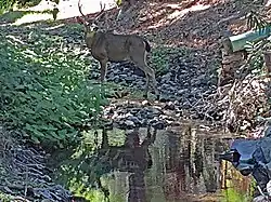 ![]() California mule deer buck straddling perennial reach of Permanente Creek between Foothill Expressway and Interstate 280 (2016) | |