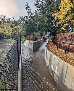 The Santa Clara Valley Water District has been working (2010–2020) to excavate as much as 23 feet (7.0 m) down to create flood detention basins to protect homes from a 100-year Permanente Creek flood, at Cuesta Park Annex, Blach Intermediate School, McKelvey Park, and Rancho San Antonio County Park.[13] Despite considerable community opposition, the SCVWD Board approved the decision to go ahead on June 17, 2010.[14] The Blach School Board voted against use of school property for a detention basin but construction permits are being sought as of 2016 for the McKelvey Park and Rancho San Antonio Park basins.[15] Construction of the McKelvey Park detention basin and recreational facilities was completed in February 2020.[16] Construction at Rancho San Antonio Park is planned to include a 15-foot deep basin and new park infrastructure.[17]