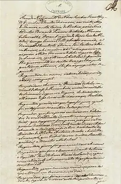 On 9 March, the leaders of the revolt signed the "Preciso" manifesto, written by José Luís Mendonça. The work accused Caetano Pinto of helping the court to oppress the rights of the Pernambucans and declared their intentions of creating a Provisional government chosen by 17 people. The document served as a provisional Constitution, as the leaders didn't have time to write a proper one.[6][12]