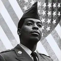 After being discharged at the end of his tour of duty on May 8, 1970, he found himself unable to find a good job and a year later reenlisted in order to further his education. He again affirmed his sexual orientation and was re-admitted. At times he dressed in drag and performed as a female impersonator under the name Simone, first in civilian life and then while stationed in West Germany where he performed at shows sponsored by the Army. His success led to engagements at enlisted men's clubs on other U.S. bases in Europe.[3] At one point in 1972 military investigators considered removing him from the service on account of his sexual orientation but ended their investigation with the conclusion that his own admissions were insufficient and closed their investigation when Watkins would not provide the names of any others.[4] Other assignments took him to Korea and then to Italy.[5] He reenlisted for a six-year term in 1974.