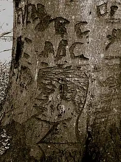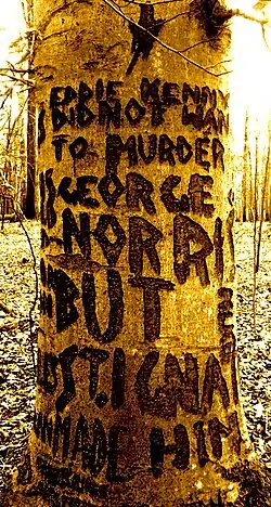 Several of the trees contain engravings that were made by mentally ill American military veterans. Many of the trees contain the engraving "Nelson Jochnou", possibly the name of one of the engravers. The engravings contain religious rhetoric, political statements, personal memoirs, and outbursts. Sometimes the carvings are a combination of political and religious statements. For example, one tree is engraved with "Christ said to police there was no Second World War." Other engravings include: