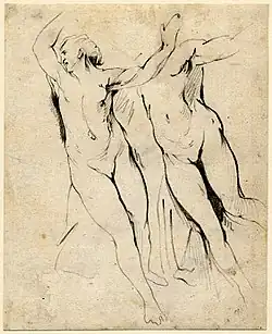 The composition of Perseus and Andromeda developed through several stages, which can be traced through x-rays and infra-red reflectography, and a surviving drawing. Some of the earlier elements can still be seen to the naked eye on close examination of the painting. At first Andromeda was on the right, in a fairly similar pose, but leaning from left to right as in the final picture. The arm to the left was raised above her head in a similar fashion, but the other arm more or less horizontal, and the head presumably looking to the centre. There is a drawing by Anthony van Dyck from his Italian sketchbook (now at Chatsworth House) recording such a figure, probably copying a lost drawing by Titian,[9] a rarity by this stage in his career.[10]