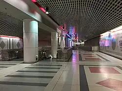 The station is decorated with a neon art piece by Stephen Antonakos. The work pays tribute to the first neon sign in the United States, which was hung in 1924 in the Pershing Square area.[9]