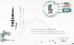 The post offices at White Sands Missile Range and Cape Canaveral issued event covers for all launches. Most covers were created using a rubber stamp with the image of a generic missile and a stamped date and time. The first eight launches of the Pershing 1a were recognized with a specially printed cover.