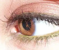 Persistent pupillary membrane (PPM) is a condition of the eye involving remnants of a fetal membrane that persist as strands of tissue crossing the pupil. The pupillary membrane in mammals exists in the fetus as a source of blood supply for the lens. It normally atrophies from the time of birth to the age of four to eight weeks.[1] PPM occurs when this atrophy is incomplete. It generally does not cause any symptoms. The strands can connect to the cornea or lens, but most commonly to other parts of the iris. Attachment to the cornea can cause small corneal opacities, while attachment to the lens can cause small cataracts. Using topical atropine to dilate the pupil may help break down PPMs.
