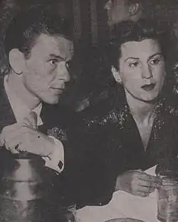 Sinatra had numerous extramarital affairs, the first of which was with blonde starlet Alora Gooding from October 1940 while in Hollywood, his "first big love away from home", according to Nick Sevano.[25] Next followed Rita Maritt, a 16-year-old Long Island debutante; the daughter of an oil baron; and Mary Lou Watts, a wealthy socialite.[26] Gossip magazines published details of affairs with the likes of Lana Turner and Marilyn Maxwell.[27]