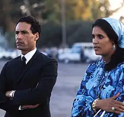 Gaddafi was born into the Qadhadhfa tribe,[49] which is a Arabized Berber tribal group.[50] His mother was named Aisha (died 1978), and his father, Mohammad Abdul Salam bin Hamed bin Mohammad, was known as Abu Meniar (died 1985). His father was a goat and camel herder before Gaddafi's seizure of power.[49] He was his parents' only surviving son, but had three older sisters.[51] By 1987, one of his sisters had died of cancer, one had married a Sirte native, and a third had married Messaoud Abdul Hafez, at one point governor of Fezzan.[52] In the 2000s, Libyan Jew Gita Boaron claimed that her family was related to Gaddafi's, with the Libyan leader's mother being the child of her aunt. According to Boaron, this branch of her family had converted to Islam before Gaddafi was born, though she still described him as "Jewish".[53] Following Gaddafi's death, this claim was repeated by Nuri al-Samara, his former chief of protocol.[54]