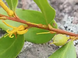 Persoonia rufa is an erect to spreading shrub that typically grows to a height of 1–2.5 m (3 ft 3 in – 8 ft 2 in) and has smooth bark, and branchlets that are covered with brownish to rust-coloured hairs when young. The leaves are elliptical, 30–80 mm (1.2–3.1 in) long and 10–25 mm (0.39–0.98 in) wide. The flowers are arranged in groups of up to twelve along a rachis up to 110 mm (4.3 in) long, each flower on a pedicel 1–3 mm (0.039–0.118 in) long with a leaf or scale leaf at its base. The tepals are yellow and 10–14 mm (0.39–0.55 in) long. Flowering occurs from December to February and the fruit is a drupe that is green or green with purple stripes.[2][3][4]