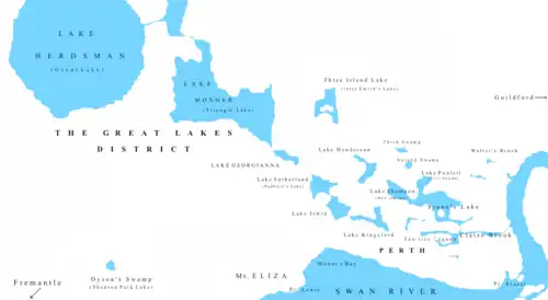 The Perth Wetlands, also known as the Perth Great Lakes or the Great Lakes District, was a collection of fresh-water wetlands, swamps and lakes located on the Swan Coastal Plain north of the city of Perth in Western Australia. Over a period of 80 years from the first British settlement in Western Australia in 1829 most of the wetlands were reclaimed for use as housing, parks and market gardens.