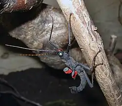 Peruphasma schultei, known as the black beauty stick insect and the golden-eyed stick insect, is a species of phasmid found in the Cordillera del Condor region of northern Peru. In the wild the insect feeds on Schinus plants, but will feed on privet, Aucuba japonica and honeysuckle in captivity. In Peru they are only known to exist in a region of less than 5 hectares, usually on volcanoes or mountains, but since their discovery they have become increasingly popular as pets worldwide due to their unusual colouration and they are now bred regularly in captivity.[2]