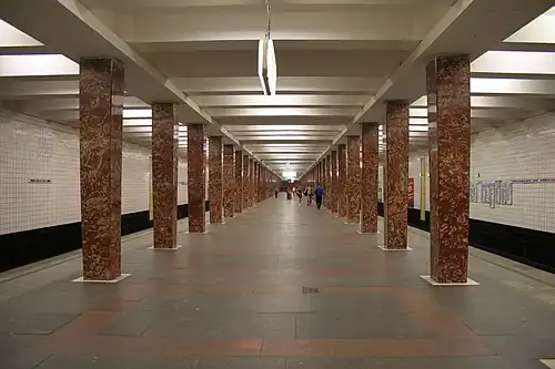 The station was the first to be built to the standard column tri-span design which would from then become the most widespread in Moscow Metro and in other ex-USSR cities, with slightly flared red marble pillars and tiled walls. The architects were M. F. Markovsky and Ya. V. Tatarzhinskaya.