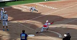 - When entering a base, the runner only has to cross the line of the base; there are no actual cushion bases like in baseball, only lines on the field showing each base's boundaries (A much larger area compared to the bases used in baseball). Similarly, the pitcher or the fielders in the bases do not have any plates to touch to make an out; having only a foot in the base is enough.