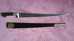 The pesh-kabz has a full tang and is traditionally fitted with walrus (دندان ماهی dandān māhi) ivory scales or handles,[15][16] but other examples have been found using ivory from the tusks of the rhinoceros, or elephant.[14][17] Still other knives may be found with scales of wood, agate, jasper, rock crystal,[9] horn, serpentine (false jade),[18] or metal.[8][10] The sheaths are typically constructed of metal or leather over wood, and may be inset with silver or precious stones.[4]