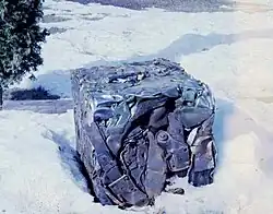 | 1974 | Compressed to seven-inch wire-wrapped cube. | Collette | |