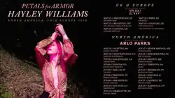 Planned to take place alongside the release of album, on March 5, 2020, Williams announced the European and North American legs of the Petals for Armor Tour, set to start in May 13 in Amsterdam, Netherlands and conclude on June 29, 2020, in Nashville, United States.[32] The pre-sale started on March 13, 2020. It was announced that the support acts would be English R&B artist Arlo Parks on the North American leg and Scottish band the Ninth Wave in Europe and the UK. However, in August 2020, Williams announced that the tour was already cancelled due to the COVID-19 pandemic and that there were "no immediate plans to schedule new dates".[33]