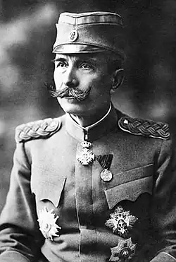 At the start of World War I, he was given command of the 1st Army. His army suffered huge losses at the Battle of Drina in 1914, but managed to stop the Austro-Hungarian offensive. Bojović was wounded in the battle, and was replaced at the army general position by Živojin Mišić.[1] In January 1916, he was appointed Chief of General Staff for a second time in place of the ailing vojvoda Radomir Putnik, who was carried by his soldiers to the city of Skadar. He held that position until June 1918, when he resigned because of disputes with the allied generals on the issue of widening the Thessaloniki Front.[1] He returned to his position Commander of the 1st Army, which broke the enemy lines and advanced deep into the occupied territory. He received the title of Field Marshal on 26 September [O.S. 13 September] 1918 for his contribution during the war.[2]