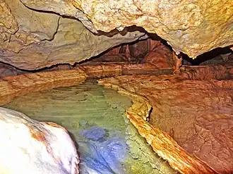 The cave also represents an example of why it is important to preserve these caves. This cave was only discovered in 1966 but surveys have shown that many of the stalactites have been broken off and the pools have been stirred. This cave contains three perfect palettes. This is a phenomenon where calcium carbonate floats on the very still water and over the millennia it creates a stone rim that appears to float on the water. The final effect can appear like a painter's palette.[2]