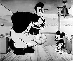 After leaving the Oswald series, Disney and his team created a cat villain for their new protagonist Mickey Mouse. Originally unnamed in the cartoons and called "Terrible Tom" in a January 1930 comic strip, the villain was called Pegleg Pete by April 1930, formalizing him as a new incarnation of the pre-Mickey bad guy.[11][12] Animator Norm Ferguson, known for developing Pluto, also developed Pete's character in several shorts and he was made to resemble actor Wallace Beery.[6][13] Pete appeared as Mickey's enemy beginning with the 1928 cartoons The Gallopin' Gaucho and Steamboat Willie. While he was seen with two legs in those films, he first appeared with a peg-leg in 1930's The Cactus Kid and would speak for the first time. He would first appear in color in Moving Day (1936), which would drop the peg-leg.[14] In the cartoons of the 1930s, Pete would be Mickey Mouse's nemesis, but would vary in professions, from an all-out outlaw (Gallopin' Gaucho, The Cactus Kid, Two-Gun Mickey) to a brutal law-enforcer (Moving Day, where Pete is a sheriff who serves Mickey and Donald Duck with an eviction notice).[15] In the 1942 cartoon Symphony Hour, Pete is a sympathetic impresario who sponsors Mickey's orchestra in a concert, which goes terribly wrong but is a great success. As Mickey's popularity declined, Pete would serve as an antagonist for Donald Duck and to a lesser extent Goofy and Chip 'n' Dale. In the 1940s, Pete would play the role of Donald's drill sergeant in several war-themed shorts (eg. Donald Gets Drafted, The Old Army Game)