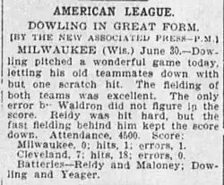 On June 30, 1901, pitching for the Cleveland Blues against the Milwaukee Brewers, Dowling threw what may have been the first no-hitter in the American League's young history.[4] He walked four batters, had one hit batsman, and otherwise allowed only Wid Conroy as a baserunner.[5] The status of this game has long been disputed; specifically, how Conroy reached base in the seventh inning.[6] While some sources credit Conroy with an infield single,[7][8] other sources indicate he reached base on an error by third baseman Bill Bradley,[4] and Conroy's career statistics do not credit him with a hit in this game.[9] An in-depth article about the game from the Society for American Baseball Research (SABR) posits, "The most plausible explanation for the divergence is that the official scorer, who was probably a Milwaukee sportswriter, changed the hit to an error after the game had ended."[4] As of April 2021, Retrosheet and Baseball-Reference.com credit Dowling with a no-hitter,[10][11] but the Elias Sports Bureau (the official statisticians of Major League Baseball) does not recognize it.[6][12]