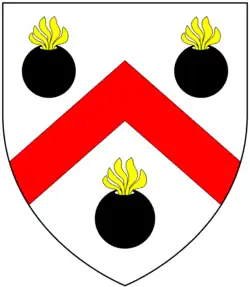 The canting coat of arms of the head of the Ball family of Mamhead, Devon, is blazoned: Argent a chevron gules between three fire balls proper.[6]