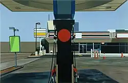 In 1996, Cain turned his attention from cars to Los Angeles gas stations and convenience stores a year before his death. These landscapes are void of any human presence; Cain even erased logos and type from the numerous signs which inhabit such places. Foliage is rendered in micro-faceted masses of green paint. When the Los Angeles paintings had their posthumous premier at the Matthew Marks Gallery in 1997, Peter Schjeldahl wrote, “I had trouble with Cain’s car pictures while being enchanted by the promise of his painterly gifts and ambition. Now we see the beginning of the promise’s fulfillment in the same instant as its end: an exceptional talent nipped in mid-blossoming, just short of full bloom. ”[2]