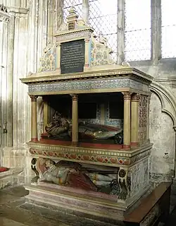 Carew is associated with an extravagant two-tiered tomb monument in the Chapel of St John the Evangelist in Exeter Cathedral, of which the primary commemorative subjects are his uncle, Sir Gawen Carew (c.1508–1584), and Sir Gawen's third wife, Elizabeth née Norwich (d. 1594), a Lady of the Bedchamber to Elizabeth I.[10][11] The monument was erected in 1589, and heavily restored in 1857. In addition to effigies of Sir Gawen and Elizabeth, it displays much strapwork decoration and heraldry, including 27 shields containing 52 distinct coats of arms marshalled in a total of 359 impalements and quarterings.[12] The whole forms "an elaborate shrine to Carew ancestry and kinship".[13]