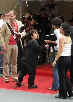 Dinklage found his breakthrough playing Finbar McBride, who is a quiet, withdrawn, unmarried man in the 2003 Tom McCarthy-directed film The Station Agent.[12] According to co-star Bobby Cannavale, the film took three years to make and was not at first written with Dinklage in mind. Cannavale said McCarthy "set out to tell a story about a guy who was a train enthusiast who had chosen to isolate himself from the world," but when McCarthy actually started "putting pen to paper" for the screenplay, he decided to write the role for Dinklage. Speaking about the role, Dinklage noted that usually "roles written for someone my size are a little flat"—often either comical or "sort of Lord of the Rings" type characters filled with wisdom; further: "They're not sexual, they're not romantic" and "they're not flawed." What attracted him to the character McCarthy had written was that it was not one of the stereotypical roles people with dwarfism play; rather, McBride has "romantic feelings" as well as "anger and ... flaws."[20] The role earned him the Independent Spirit Award and Screen Actors Guild Award for Best Actor nominations.[21][22] In the New York Observer, reviewer Andrew Sarris wrote, "Dinklage projects both size and intelligence in the fascinating reticence of his face."[23] Besides being Dinklage's highest-rated film on the review aggregator Rotten Tomatoes,[24] The Station Agent was modestly successful at the box office, earning over $8 million against its small budget.[25][26]
